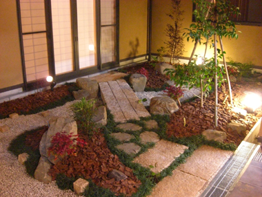 採光を確保するとともに和の落ち着いた空間とするため、建物の中央に食堂に面した中庭(石庭)を設けてある。